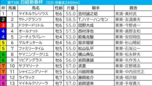 人気馬の安定感を活かしつつも、馬場適性を重視し、若い馬や条件戦からの昇級馬・逃げ馬など、ひと工夫した穴狙いも必須。今年の京都芝2400mならではの攻略で、高配当を狙ってみましょう!出馬表は以下の通り。