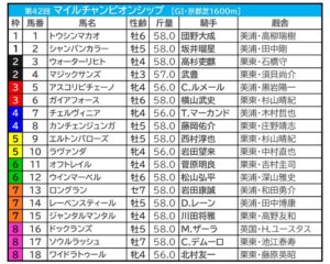 今年のレースは例年以上に混戦模様となっています。特にジャンタルマンタルとソウルラッシュという世代を代表する2頭の枠順が勝負の行方にどう影響するのか、レース当日は最初から最後まで目が離せません。ぜひ枠順を頭に入れながら、本年のマイルチャンピオンシップを楽しんでください。枠順は以下の通り。